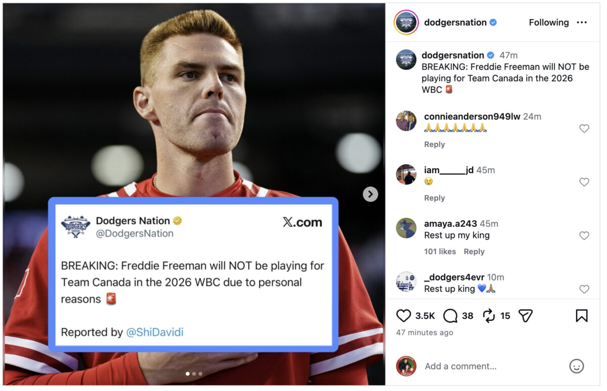 Canada baseball fans are going to be heartbroken once again as Dodgers first baseman has announced that he will not be participating in the World Baseball Classic for Team Canada. The plan was for Team Canada to use Freeman as a Designated Hitter, but due to “personal reasons,” Freddie has withdrawn, leaving a gaping hole of veteran leadership and offensive output with his bat.